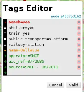 - The suggested tags correction (with + for adding a missing tag, − for deleting this tag, or ~ for modifying it).