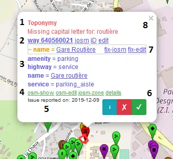 - ℹ Help on OSM wiki: open a new browser tab with help about this specific type of issue on the wiki and tips on how to fix it (see the list of issues). In the help window you can also hide all errors if this type from the map.