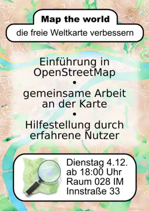 Map the World – die freie Weltkarte verbessern ist eine Einführung für Neueinsteiger in die Arbeit an der OpenStreetMap-Karte. Wer seine ersten Gehversuche beim Bearbeiten der Karte gerne unter erfahrener Anleitung machen möchte, ist hier richtig!