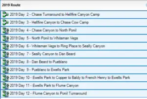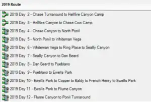 This quick start is more or less specific to folks who have Garmin GPS units the plan to carry and users of Garmin Base Camp that want experiment with routes to determine the best route for your trek. Philmont rules require crews to camp at the designated site each night Violators of this rule my have their trek terminated as they put themselves and Philmont staff at risk should an evacuation such as that during the 2002 Ponil Complex fire caused. With that said, crews are in control of which trails they take each day to the designated camp. My 2019 did this twice, once to divert by a staffed camp to get another stamp on their Philmont Passports and once to optimize our Baldy side hike and food pickup day.