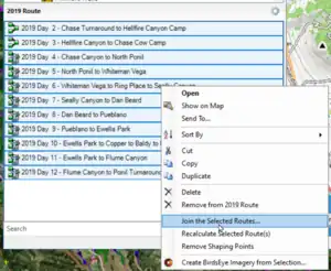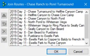 When creating your Philmont routes, the recommendation is to create one track for each day. Once downloaded to a GPS it is easy to pull these up. In Base Camp, one can open all these individual tracks but the elevation plot produces draw over themselves. To get an elevation plot for the entire trek it is easiest to combine all the data tracks into a single track so an elevation graph for the entire trek can be generated. Doing so is also convenient for comparison to the elevation track in the Itinerary Guidebook as a verification your crew mapped the recommend route. These are the steps to combine daily routes into an overall route.