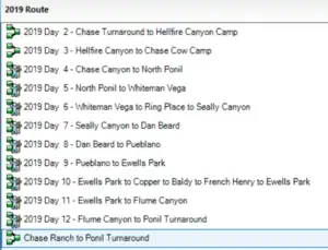 | 1 | Create routes for each day. Hiking starts at Philmont on day 2 (day 1 is in base camp). A space can be used in front of the single digit days for the routes to naturally sort in order (using the date you'll be on the trail that day is another method). | ![]() |