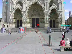 Checking: The center of the image (intersection of the two diagonals D1 and D2 'M' ) must be on the horizon -> Facade lines are ortogonally.