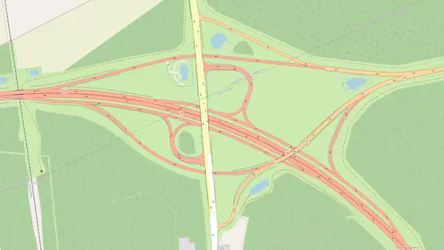 primary(DK44) do drogitrunk(DW902) z pominięciem A1, to łącznice oznaczone są jakomotorway_link, ponieważ są oznakowane w terenie odpowiednim znakiem i obowiązują na nich restrykcje właściwe autostradom. - ↑ Przykład łączników (prawoskrętów) na skrzyżowaniu jednopoziomowym: skrzyżowanie DK42 i DK74 jest wyposażone w dwa wydzielone prawoskręty – w relacjach północ-zachód i południe-wschód