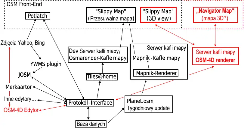 • Stworzenie koncepcji opisu (tagging) kompleksowych struktur 3D wzbogaconych o aspekt czasowy (stad 4D), które można będzie wprowadzać w OSM na mapę dwuwymiarowa, jeszcze zanim powstanie odpowiedni 3D viewer i edytor tych informacji.