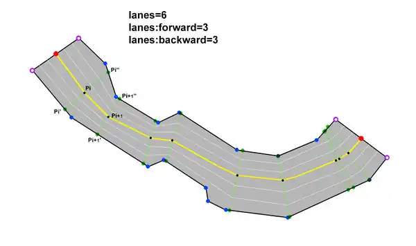 Zakładając, że liczba pasów ruchu na drodze: (tertiary, secondary, primary, residential..etc.) między punktami K1 i K2 jest znana, mogą być renderowane przez użycie obrysu ulicy jako granicy w celu orientacyjnego określenia geometrii pasów. Oto przykład z 6 liniami: