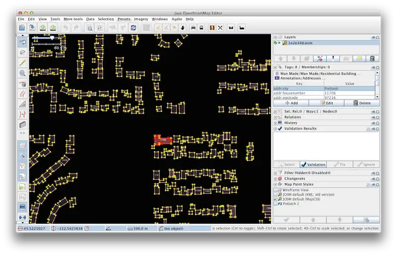 - Contributors will download a section of buildings, and a section of address nodes and validate it in JOSM, verify them with local knowledge & against the most recent imagery available; likely NAIP imagery with Bing as a fallback.