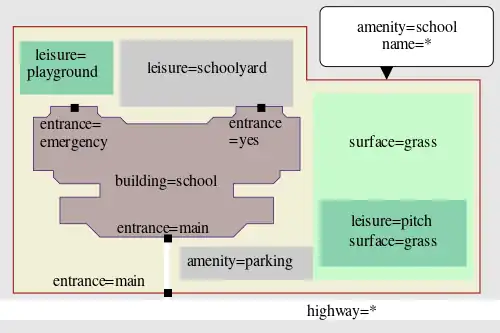 entrance=main- entrada principal.entrance=yes- entrada secundária.entrance=emergency- saída de emergência.entrance=service- entrada de serviço (carga/funcionários).barrier=*- delimitação física da escola (aplicado na área principal). Por exemplo, com rede à volta:barrier=fence+fence_type=chain_link. Também pode ser usada nas entradas para mapear uma cancela, por exemplo,barrier=gate.