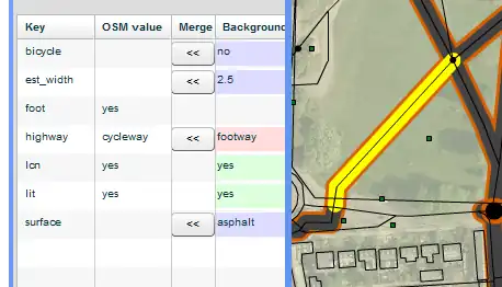 However, by contrast the process of getting to the merging UI is not fully intuitive. Although the user might see the small text “You have selected a Background Feature.” which hints about some special status, there is no visual indication that Control-click is the special shortcut to be used, and it has to be selected very carefully because there are two lines in the region (the thick, now yellow, one, and the OSM one, requiring considerable manual dexterity.