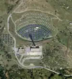 - A tower receiver, often circular in shape with a bright reflection on top.