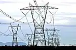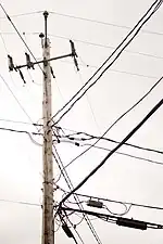 | 25 kV | Distribution | Utilisée dans la majorité du système de distribution. 3 phases | Poteaux de taille ordinaires, ou des câbles souterrains. La présence de plusieurs circuits peut ne pas être évidente sur la photographie aérienne. Les systèmes 25 et 14.4 kV sont généralement bouclés, avec de nombreuses branches monophasées ou triphasées et des connexions de secours à partir d'autres postes fournies par des sectionneurs ouverts à l'extrémité des départs. |