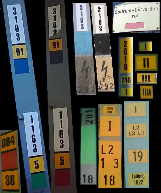 Im Nebenstehenden Beispiel sieht man die Leitung 3103 mit den beiden Systemen (3 Leiterseile = 1 System) blau und schwarz. Diese Fotos wurden jeweils am Mast 91 und 292 jeweils links und rechts aufgenommen. Hier haben beide Systeme den gleichen Verlauf. Wenn sie unterschiedliche Endpunkte hätten würde eines weg führen und ein anderes dafür mit anderer Farbe dazu kommen. Auf dem Mast 91 verläuft zusätzlich auf dem Mast die Leitung 1163 mit den Systemen rot und grün. Diese LEitung bestehend aus zwei Systemen hat extra Mastnummern (hier Nummer 5).