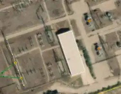 Transformers are generally easy to identify in aerial imagery: they appear as large rectangular blocks, often metallic and distinct from other equipment, with lines connected to them.