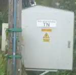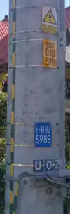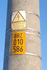 - w postaci metalowej tabliczki lub naklejki na słupach SN, stacjach transformatorowych SN/nN, złączach kablowych SN oraz (bardzo okazjonalnie) słupach nN.