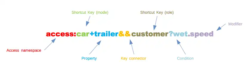 Every key/value entry starts with access=*. In case a transportation mode or role is defined (see chapter below), the separator ":" is appended to "access". Therefore it functions as a namespace prefix.