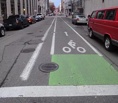 A buffered bicycle lane on downtown Portland's Southwest Stark Street