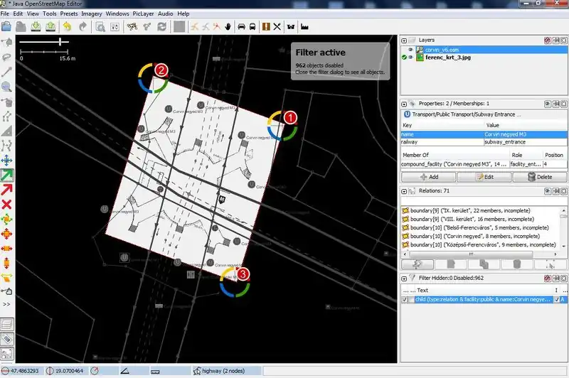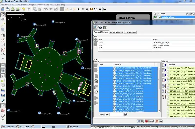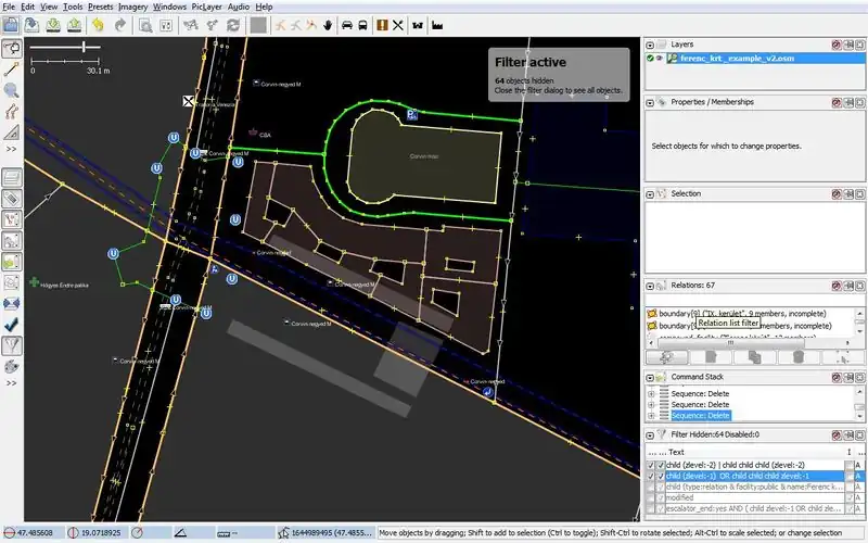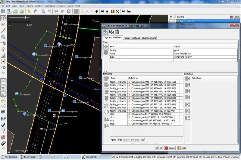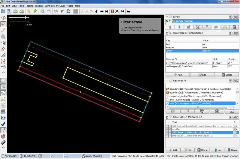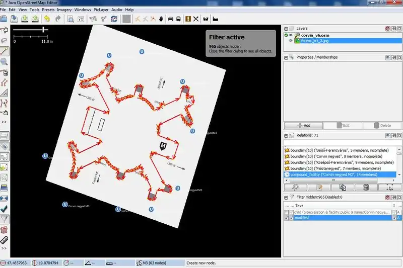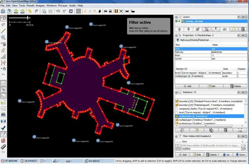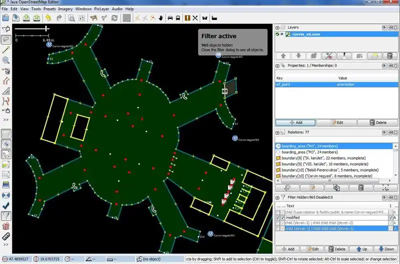 • for better visibility, create filter for facility, then disable this filter. Filter text: child (type:relation & facility:public & name:Corvin negyed M3)
