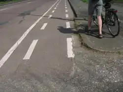 • fietssuggestiestrook (marked only by one dashed line or red colour, no legal status, function similar to shared lane markings, but differently from those rather desintegrating than integrating)[5]
