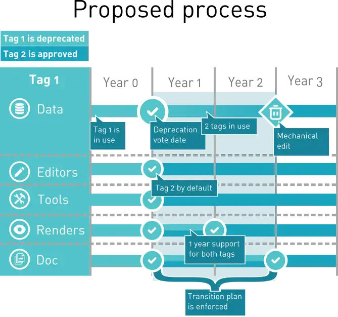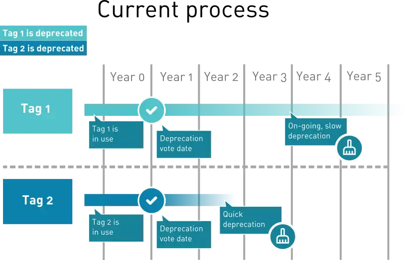 Today, a Proposal process leads to an approval/rejection decision to replace a deprecated tag. Once a tag is declared deprecated, little follow-up is given to make sure the community get rid of it.