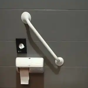 A wall-mounted grab rail in a diagonal position (or which has a diagonal part). |