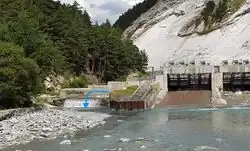 Such a dam is intended to divert part of a river into a tunnel leading to power plant turbines. About 3.5 m3 per seconds go into the intake while only 0.6 remain in the natural environment.