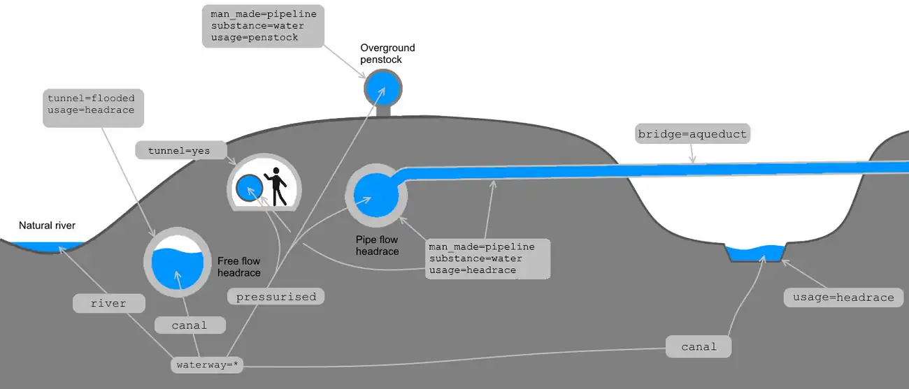 | Definition: | Propose to map hydropower water adduction systems involving tunnels, canals, ducts and pipes using waterway=pressurised and man_made=pipeline when appropriate