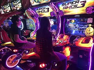 | arcade_game | motorcycle | Features a motorcycle you can ride on. This is connected to a game that responds to the movement on the vehicle. | ![]() | |
