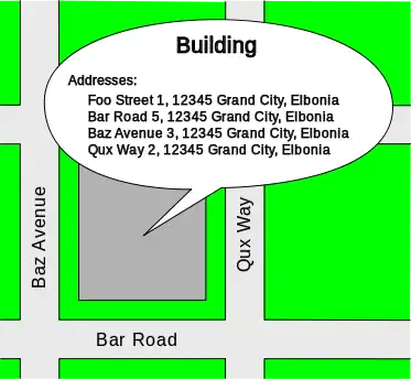 - a node with addr:country=EL + addr:city=Grand City + addr:postcode=12345 + addr:street=Qux Way + addr:housenumber=2