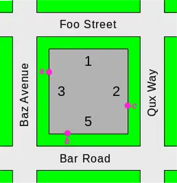 - for the top priority address, determine the side of the object (building) closest to the relative street