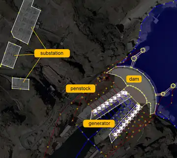Hoover Dam is a good example of a complex hydro power plant. The whole facility is tagged as the power=plant.