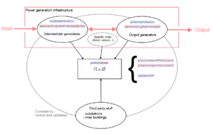 In details, different generators could get involved in the power generation process. Thus we would make the distinguish between intermediate generators which produce usefull power for output generators. Output generators produce power which is send outside the power plant. They are the only generators used to compute the overall capacity of a power plant. Examples are available at the end of this proposal.