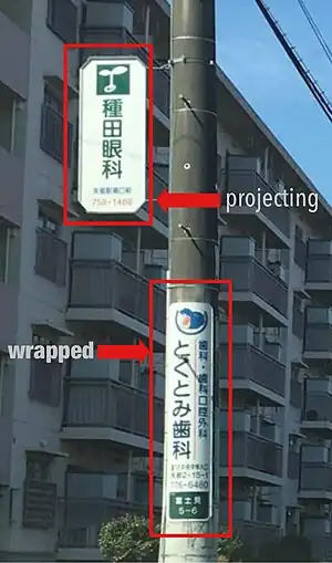 The purpose of this proposal is to standardize tagging methods for representing advertisements placed on utility poles. This proposal introduces the tag “`sign:type=projecting;wrapped`” to describe the shape of an advertisement placed on a utility pole. And this proposal introduces further proposes to specify the name of individual advertisements as “`name:projecting=Company A`” and “`name:wrapped=Company B. If the proposal is accepted, it will be possible in the future to use only projecting ads, only wrapped ads, etc., depending on the situation.