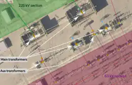 • Main transformers forward power between two or more different power grids (here between 63 000 volts <=> 225 000 volts sections and from 63 000 volts to distribution grid in blue), auxiliaries are branched on one particular voltage feeding another main unit.