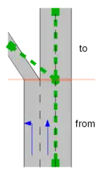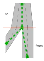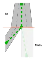 2 A one-way road with two lanes, where the rightmost lane forks into two lanes. To way