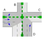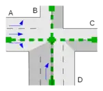 • If for the leftmost lane of the Entering Way a turning indication with *left is specified (note: some turning indications may have been removed while processing Straight On connections):