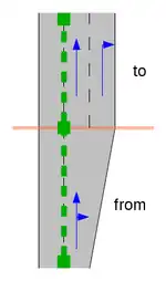 • The i-th centre lane of the From Way (viewed from left to right, starting with 1) now connects to the leftmost centre lane of the To Way; continue to the right until you reach the rightmost centre lane of either the From Way or To Way. Note: if i is greater than the number of centre lanes in the From Way, no centre lanes are connected between the From Way and To Way. This is usually a data error. In such a situation routing applications might connect the rightmost centre lane of the From Way to the leftmost forward lane of the To Way.