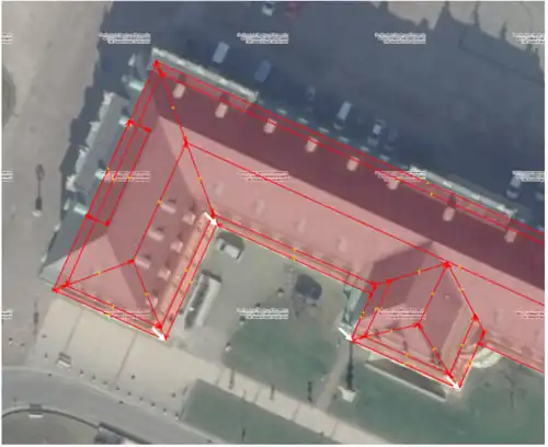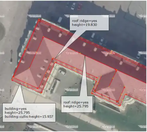 This sections is intended to provide some guidelines on how complex roof structures can be modeled using the popular JOSM editor. Although JOSM is designed as a 2D editor, it can be used to add roof details to building footprints, but it requires a good sense of spatial imagination. JOSM provides some tools such as arranging rings to form rectangular shapes and straighten lines, which are quite useful for our task. It also allows to switch between different image sources and detects whether high quality local imagery is available, making it easy to pick the besst possible source for tracing roof lines. In the following example I use the same building as above and focus on the lower left part. The structure of this building is quite complex. It featurese a hipped roof, many dormers, ledges, some portals with figures on them, varying roof heights, round staircases etc. Most problematic is that the height of the roof base or eaves is not consistent and that the roof stretches down to lower levels at the wings. A possible solution to fix this is to split the building into several parts so that the building:eaves:height tag could be assign accordingly. However, in this example, I use vertical roof structures to model facade parts that reach higher than the specified eaves height, so that the 2D rendering remains unaffected.