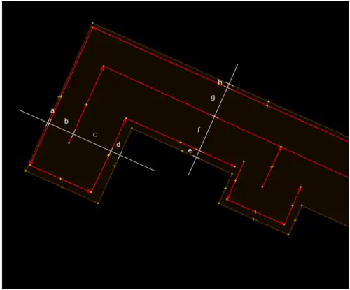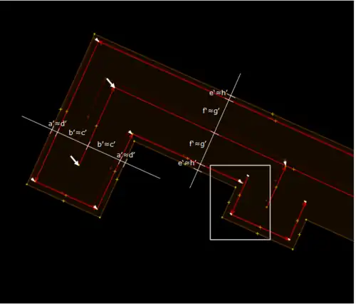 All lines traced from aerial imagery are positioned incorrectly, due to the perspective distortions. At large buildings you might even see that vertical edges have different angles. This is because aerial imagery is never exactly oblique, even if it has been rectified. For the sake of simplicity, we assume that at least the proportions of structures at the same height level are already correct. In our example, we assume that the roof is axis symmetric along the outer lines. Select all lines with the same height value and move them so that all distances betweem them and to the outer ring are equlized (a'=d', b'=c', e'=h', f'=g').