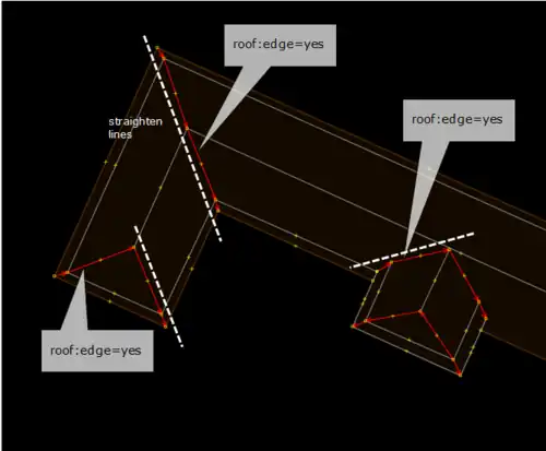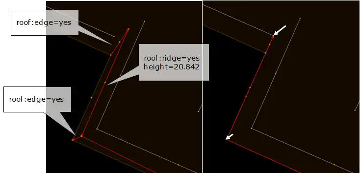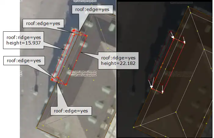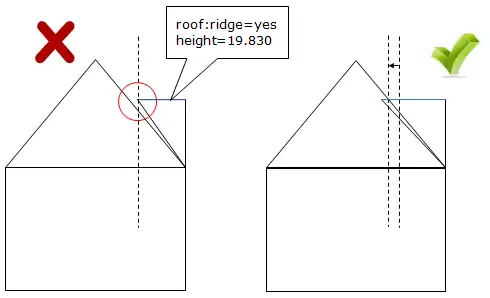 2. Edges connecting the ridges with the eaves tagged as roof:edge=yes. Although they could be guessed it is better to include them in order to create closed rings for easier processing.