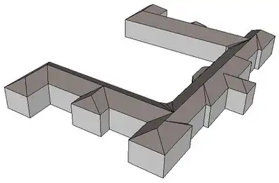 The areas between eaves, edges and ridges are expected to be coplanar so that they can be easily polygonized. Some buildings have little jutties and ledges along the edge. In this case the intersection of the roof surface with the wall must be approximated so that the roof surface remains flat. Im my example the ledge in the middle of the building would be modeled by adding a flat top. Alternatively, the roof surface could continue downwards cutting away a part of the wall.
