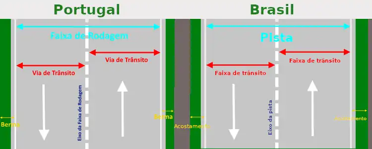 faixa de rodagem (Pt) ou pista (Pt-BR). Note que faixa de rodagem no português do Brasil não significa o mesmo que no português europeu, mas é um sinónimo/sinônimo para faixa de trânsito (Pt-BR). Veja a figura abaixo para diferenças básicas na nomenclatura de trânsito em Portugal e no Brasil.