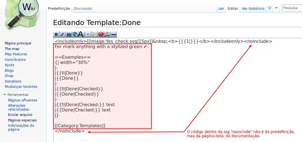 O texto preto dentro das caixas vermelhas é o código wiki que gera o resultado apontando pelas setas.