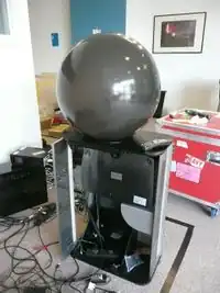 The Pufferfish display consists of a Commercial grade projector which projects a image through a fish-eye lens into a shere. The lens is at the very base of the sphere and cannot be seen in this picture. Also at the base of the sphere is a infra red projector and sensor which is used to interact with the sphere through a second fish-eye lens. The interaction is then received as a X-Y coordinate through a control box seen at the back. More information on the control box later. The the projector works the same as ordinary projectors but the image is sent through the fish-eye lens. The Pufferfish-projector interface is shown here