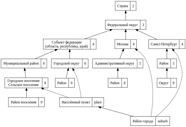 admin_level=nможет содержать внутри себя только границы сadmin_level=m, где m строго больше n. - Внутри границы населённого пункта могут находится точки place только со значением suburb (и точка самого пункта, разумеется).