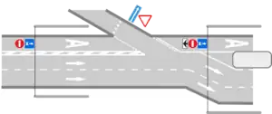Изменение расположения выделенной полосы на проезжей части (например при отдельной полосе для правого поворота или изменении числа полос) необходимо “разрезать” дорогу в месте перестроения.