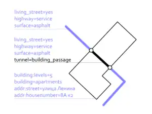 Проезды, проходящие через здания, обозначаются как =building_passage (арка здания). Проезд должен быть ограничен стенами здания.