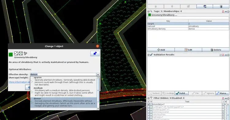 Стиль карты JOSM "сведения о зелени" (Greenery details) можно использовать для визуализации этого тега и значений тегов shrubbery:density=* и height=*: