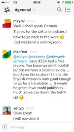 Члены команды часто общаться по электронной почте, из-за того что "она просто работает в любое время и в любом месте". Мы стремимся использовать современные средства связи и перенести большинство обсуждений в Slack. Slack предлагает групповую связь в удобном виде, он работает в веб-браузере, может быть доступ с помощью приложений для мобильных устройств, поддерживает XMPP и IRC, и, оказывается, очень эффективен.
