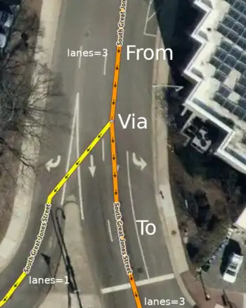 A from-via-to relation could be used here to represent which lanes in the It should have the tags Note that lane #3 in the |