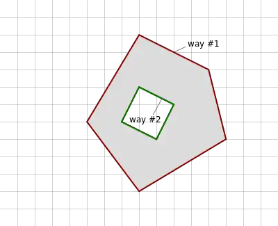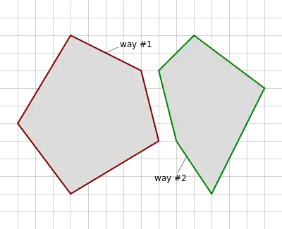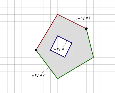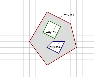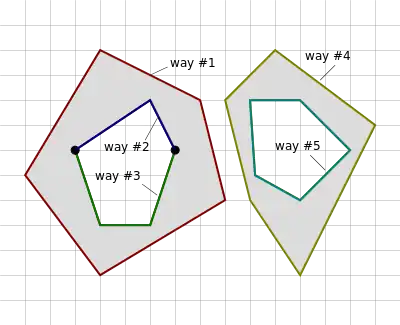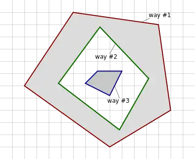| This is an example of an invalid multipolygon as way #2 and way #3 are not connected. | ![]() |